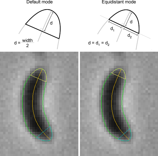 Contour: The basic particle contours produced by the ImageJ edge-detection algorithm are refined into sub-pixel resolution contours using a set of subdivision/interpolation algorithms. Crude polygons are first subdivided using a variant of the Catmull–Clark algorithm and then simplified using a Reumann-Witkam algorithm. The Reumann-Witkam algorithm uses the specified Resolution as the rejection criterion. The simplified polygons are then interpolated at the specified Resolution using a spline function and then smoothed using a linear smoother. The smoothed polygons are eventually enlarged or reduced using edge extrusion algorithms. Medial axes are generated from smoothed particle contours using a skeletonization algorithm. Medial axes are then simplified using a Radial Distance algorithm at the specified Medial axis Resolution. Poles are located using the specified mode (see Pole Mode for more details).
