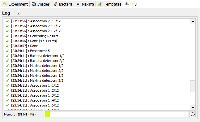 This panel contains all the log messages. MicrobeJ tracks various actions, warnings and errors. Press to clear the memory and the current set of logs.