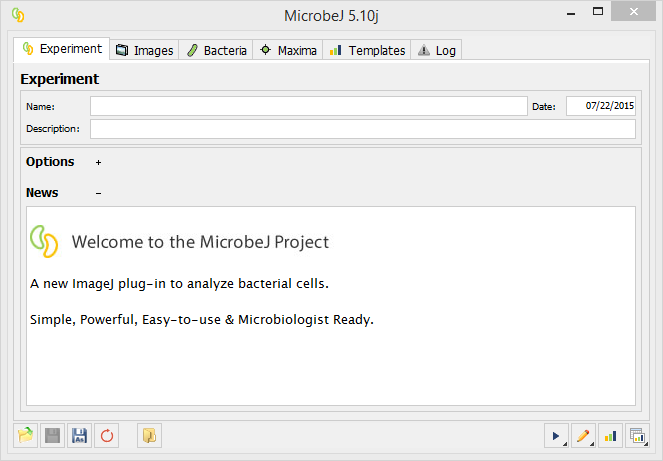 The main interface of MicrobeJ contains several tabs which allow the user to set up an experiment (Experiment), select or load a set of images (Images), define parameters for bacterial cell detection and analysis (Bacteria), detect fluorescent foci (Maxima), define and use templates (Templates), and track any errors that might arise during analysis (Log). Note that some of the tabs are only active once an image(s) has been loaded or when the related tab has been activated. This interface also contains several button located at the bottom of the window that are accessible no matter which tab you access.