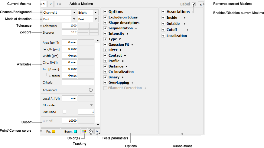 This panel contains settings related to the detection of particles using a local maxima detection algorithm (see ImageJ Local Maxima Detection for more details). Different category of Maxima can be detected using specific parameters. Each type consists of specific attributes (tolerance, z-score, shape and signal intensity) designed to detect and evaluate objects in the specified channel of the active Image and specific options (mode, colors) used to generate the final particle. Note that different category of Maxima can be detected on the same channel. Press