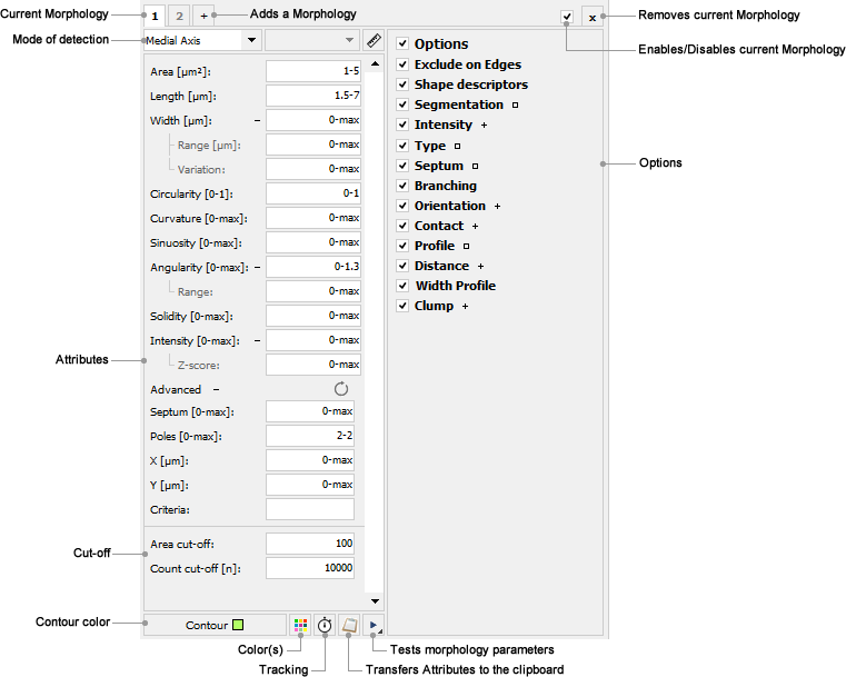 This panel contains settings related to the detection of objects using a set of one or more morphologies with the associated parameters. Each morphology consists of specific attributes (size, shape and signal intensity) designed to evaluate objects in the active Image and specific options (mode, resolution, colors) used to generate the final particle (see Figure 1). Each object is tested against all the active morphologies until the specific attributes are met. If not, the object is rejected. When an object meets the attributes of a specific morphology, the options associated with this morphology are used to create the final particle. Press