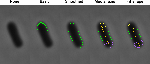 Mode of detection: Allows any of the four different modes of detection to be selected. Four modes of detection are available: Basic, Smoothed, Medial Axis and Fit Shape (see Figure ). Each mode corresponds to different degrees of resolution with which the final particle will be created. Press