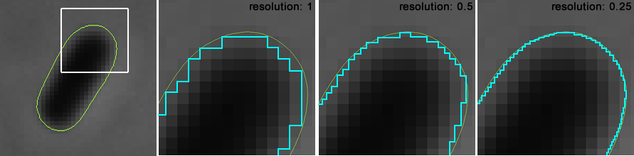 Resolution: The resolution in pixels (1/scale factor) used to resample the selected image before measuring the gray values of all the pixels inside the particle contour (see Figure 1). Note that a value of 1 will keep the actual resolution of the selected image. Default setting is 1.