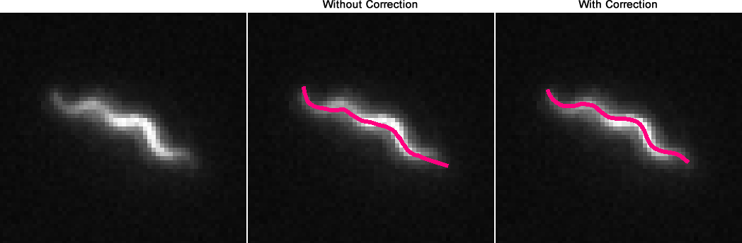 Filament Correction +: If checked, the position of each point along the filament is adjusted smoothly using a local maxima detection algorithm (see Figure 1). For each point, pixel values are measured along the orthogonal axis. This option is enabled when the mode of detection is ‘Filament’.