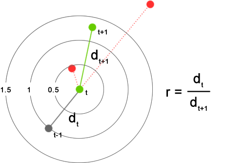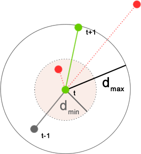 Acceleration: Particles on the next frame with an acceleration ratio outside the specified range are rejected by the tracking algorithm. The acceleration ratio is the ratio of the distance between the particles on the next frame and the current particle (dt+1) and the last distance traveled by the current particle (dt) (Figure 3).