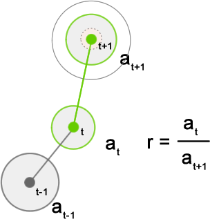 Area: Particles on the next frame with an area ratio outside the specified range are rejected by the tracking algorithm. The area ratio is the ratio between the area of the particles on the next frame (at+1) and the area of the current particle (at) (Figure 4).